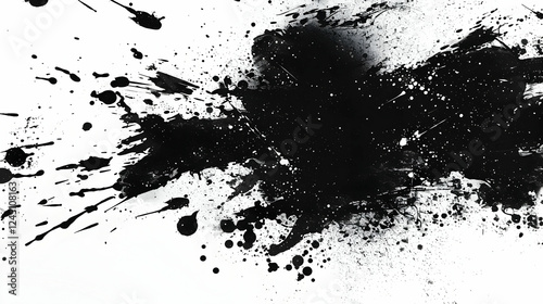 Abstract black ink splatter on a white background, creating a dynamic and artistic effect