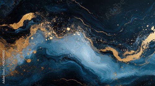 Abstract blue and gold fluid art with marble waves and metallic accents