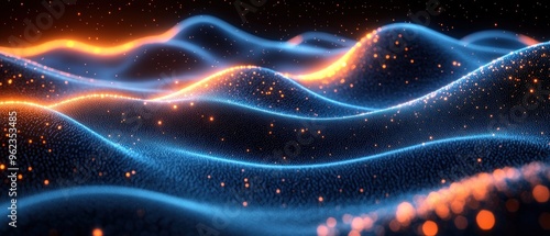 blue, orange, abstract, wave, pattern, light, glow, sparkle, shimmer, glistering, bokeh, background, digital, design, texture, bright, vibrant, futuristic, technology, modern, dark, night, cosmic, space, galaxy, nebula, fantasy, surreal, motion, dynamic, energy, flow, soft, smooth, elegant, three-dimensional, rendering, illustration