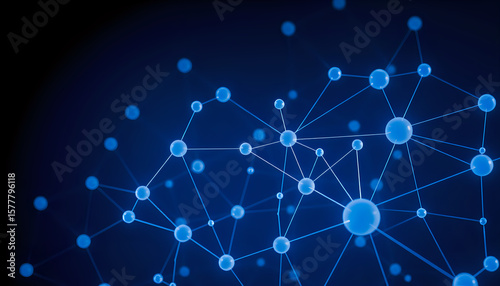 Abstract blue and white interconnected spheres with glowing nodes, symbolizing a digital network on a dark background.