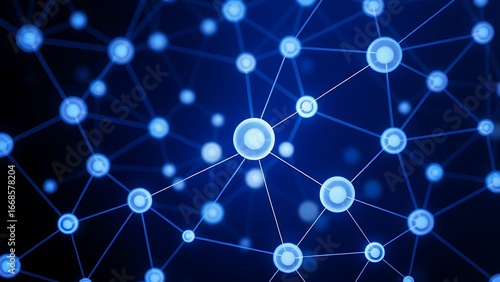 Abstract blue and white interconnected spheres with glowing nodes, symbolizing a digital network on a dark background.