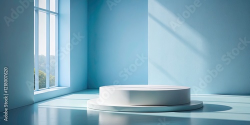 Abstract Blue and White Round Corner Cube Podium for Product Display in Minimalist Scene with Natural Window Lighting