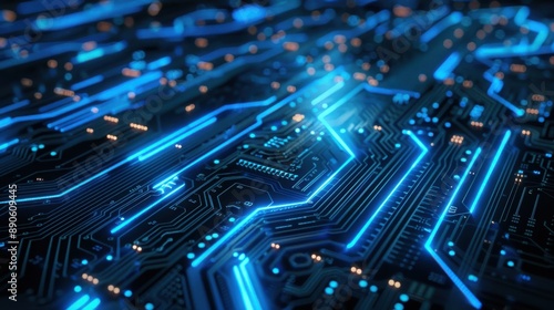 Abstract blue circuit board background with glowing lines and patterns, technology concept for digital chip design or data transfer in information technology