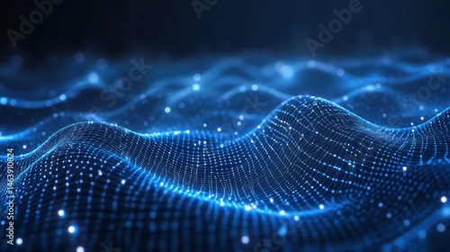 Abstract blue digital wave pattern. Glowing particles form flowing curves. Tech background