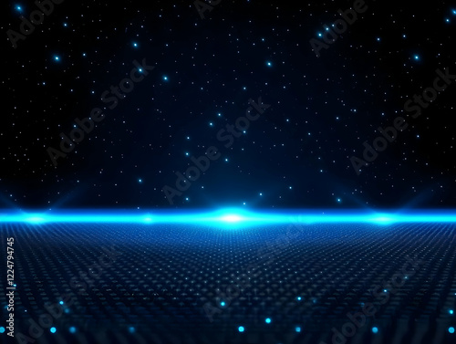 Abstract Blue Glowing Grid Background Extends into a Starry Night Sky with Bright Lights