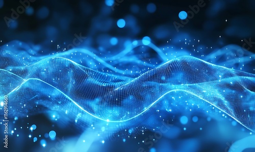 Abstract blue tech background with digital waves, dynamic network system, artificial neural connections, cyber quantum computing and electronic global