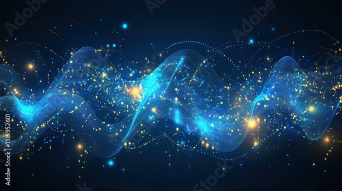 wave, particle, abstract, digital, art, blue, gold, energy, light, glow, sparkle, shine, flow, motion, dynamic, texture, background, design, illustration, graphic, technology, science, cosmos, space, universe, futuristic, modern, elegant, stylish, creative, artistic, vibrant, bright, dark, night, mystery, magic, wonder, serene, calm
