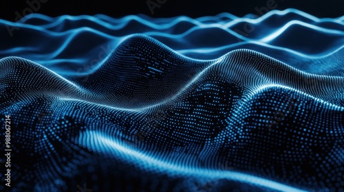 wave, abstract, digital, pattern, texture, design, technology, background, blue, dark, light, concept, art, graphic, futuristic, modern, illustration, style, three-dimensional, rendering, geometric, shape, surface, smooth, curve, line, glowing, sparkle, dynamic, flow, movement, space, pixel, grid, wireframe, dot, noise, gradient