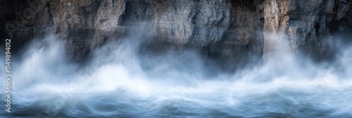 Abstract blurred image of powerful waves crashing against a rocky cliff face.