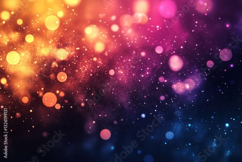 Abstract bokeh background, close-up view of gold, pink, and blue glittering spots, cosmic concept, blurred lights, sparkle, celebration.