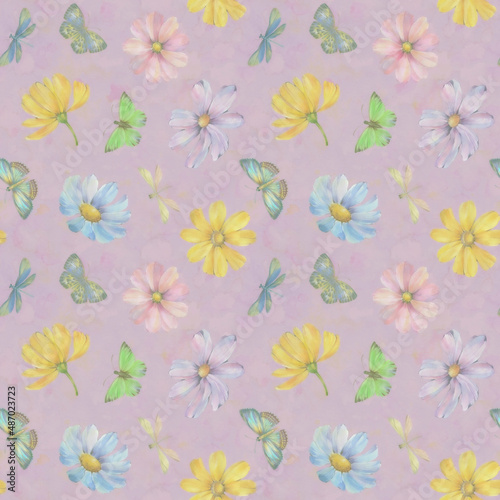 Abstract botanical background of flowers, butterflies and dragonflies. Seamless ornament for wrapping paper, design, print. Delicate flowers painted in watercolors, digitally processed.