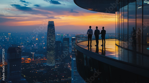 Abstract business team stands on the peak of success amid tall, innovative Smart city and graphs with statistics to analyze business potential and predict future developments in company growth.
