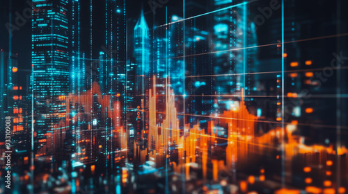 Abstract business team stands on the peak of success amid tall, innovative Smart city and graphs with statistics to analyze business potential and predict future developments in company growth.