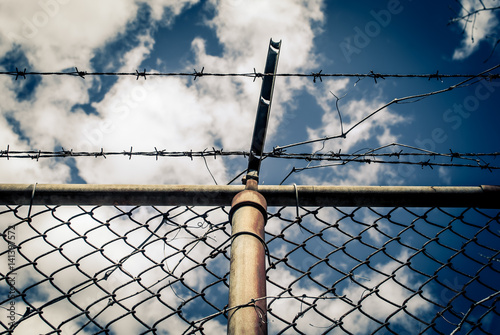 Abstract chain link fence with barbed wire. Broken chain steel fence with barbed wire and branches. Branches and roots on steel gate frame. Industrial art and design. Abstract sky colorful background.