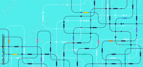 Abstract circuit network background with colorful lines and nodes on blue backdrop