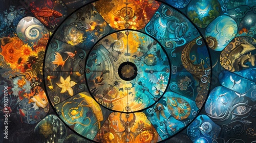 Abstract circular design with vibrant colors and intricate details, evoking a sense of mystery and wonder.