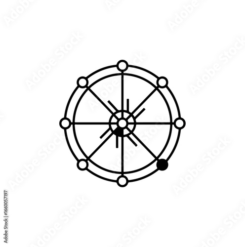 wheel, circular, design, symmetry, spoke, illustration, graphic, vector, symbol, symbolism, element, icon, image, black-and-white, pattern, simple, abstract, isolated, design element, background, geometric, line art, art, graphic design, monochrome, shape, modern, style, flat, drawing, copy space, decorative, ornamental