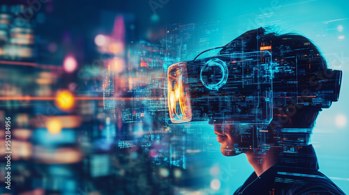 Abstract clause-up digital man face with VR head set as a wallpaper background illustration