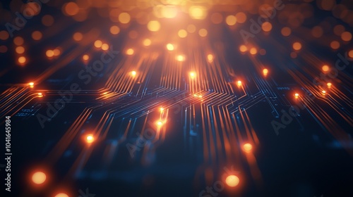 Abstract close-up of glowing circuit board with orange lights, representing digital technology and connectivity in electronics.