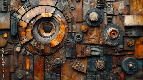 Abstract collage of metallic textures featuring gears, circles, and intricate patterns in warm orange and brown tones.