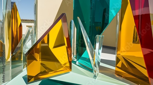abstract, art, artwork, colourful, glasses, geometric, shape, installation, sculpture, modern, contemporary, design, architecture, building, light, shadow, colours, texture, pattern, background, creative, artistic, stylish, vibrant, bright, orange, yellow, red, green, blue, teal, transparent, faceted, prism, polygonal, angular, crystal, modern art