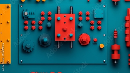 Abstract colorful machinery control panel with buttons, knobs and gears.