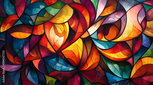 Abstract, colorful stained glass background with flowing leaves and swirls