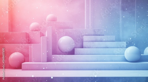 Abstract composition featuring geometric shapes and spheres in pastel pink and blue tones with a dreamy, ethereal atmosphere.