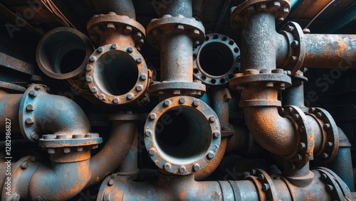 Abstract composition of aged industrial steel piping showcasing rust and intricate connections in a manufacturing setting.