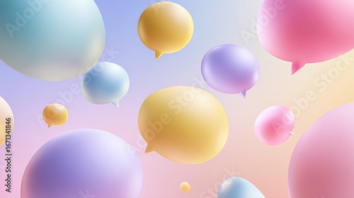 Abstract composition of floating speech bubbles against a soft pastel gradient background.