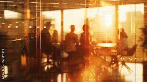 Abstract Corporate Meeting Scene with Blurred Figures and Warm Lighting