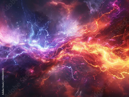 Abstract cosmic background with blue and orange lightning streaks in a nebula.