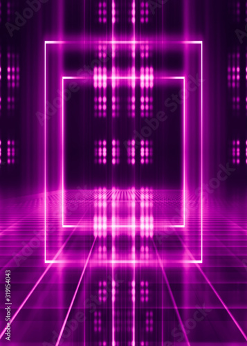 Abstract dark background with purple neon glow. Neon luminous figure in the center of the stage. Light lines on a dark background, smoke, smog
