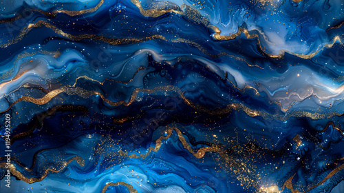 Abstract Dark Blue Alcohol Ink Art Background with Shimmering Glitter Swirls. Generative AI