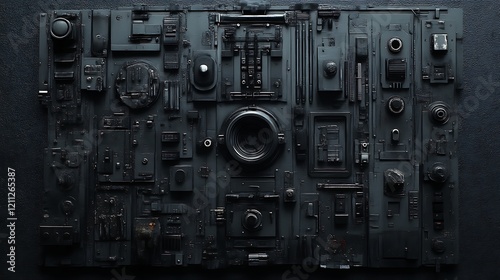 abstract, dark, grey, technology, panel, design, futuristic, industrial, mechanical, electronic, component, circuitry, hardware, contraption, device, machine, system, structure, texture, surface, background, collage, mosaic, grid, pattern, shape, form, object, element, detail, aesthetic, modern, complex, intricate, sophisticated, monochrome, metallic, matte, shadow, contrast, depth, three-dimensional, render, illustration, digital, art