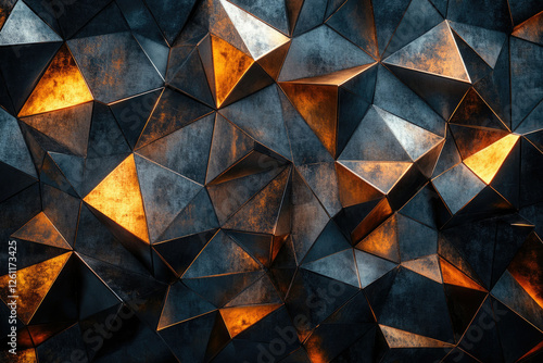 Abstract dark metallic background with gold accents, polygonal texture, geometric shapes.