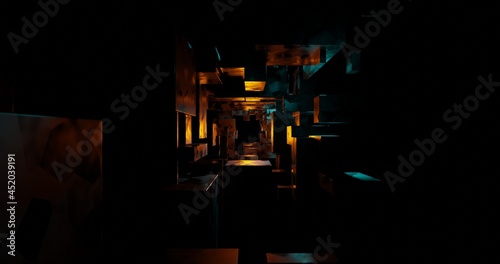 Abstract dark room background with orange and blue lights. 3D rendering.