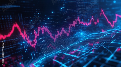 Abstract data visualization with digital graphs and neon colors representing financial trends on a high-tech background.
