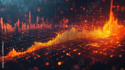 Abstract data visualization with vibrant orange and blue colors, representing digital analysis and trends.