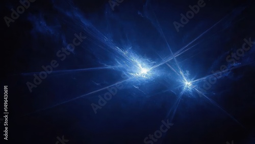 Abstract deep blue cosmic scene with bright glowing light bursts emitting rays in a dark space environment