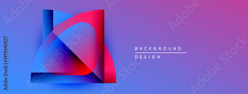 Abstract design features layered shapes, vibrant blue, red hues. Gradient purple background creates modern visual impact.