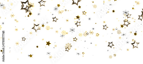 Abstract design with golden stars and glittering snowflakes on a clean white backdrop, perfect for festive or celebratory themes.