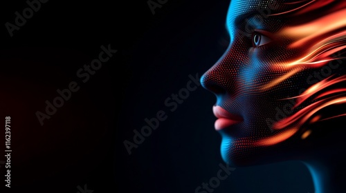 abstract, digital, art, profile, woman, face, dot, glowing, fiery, line, dark, background, style, technology, futuristic, modern, energy, light, colours, red, orange, blue, black, design, illustration, graphic, visual, aesthetic, creative, artistic, beauty, female, portrait, neon, dynamic, texture, pattern, intricate, complex, stylish