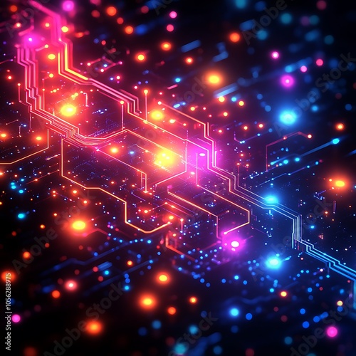 Abstract digital circuit board with glowing lights.