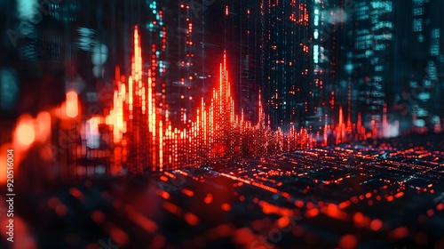 Abstract digital city skyline with red glowing lights and bokeh effect.