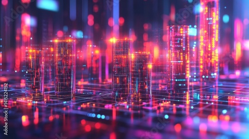 Abstract digital cityscape at night with glowing buildings and vibrant colors.
