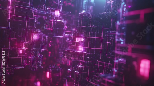 Abstract Digital Cityscape Glowing Pink Neon Cubes