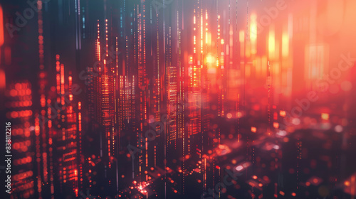 Abstract digital cityscape with glowing red and orange lights, representing futuristic technology, innovation, and data streams.