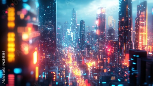 Abstract digital high-tech cityscape with panoramic view of neon-lit urban buildings and futuristic architectural designs.