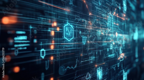Abstract digital interface with glowing data streams and icons.